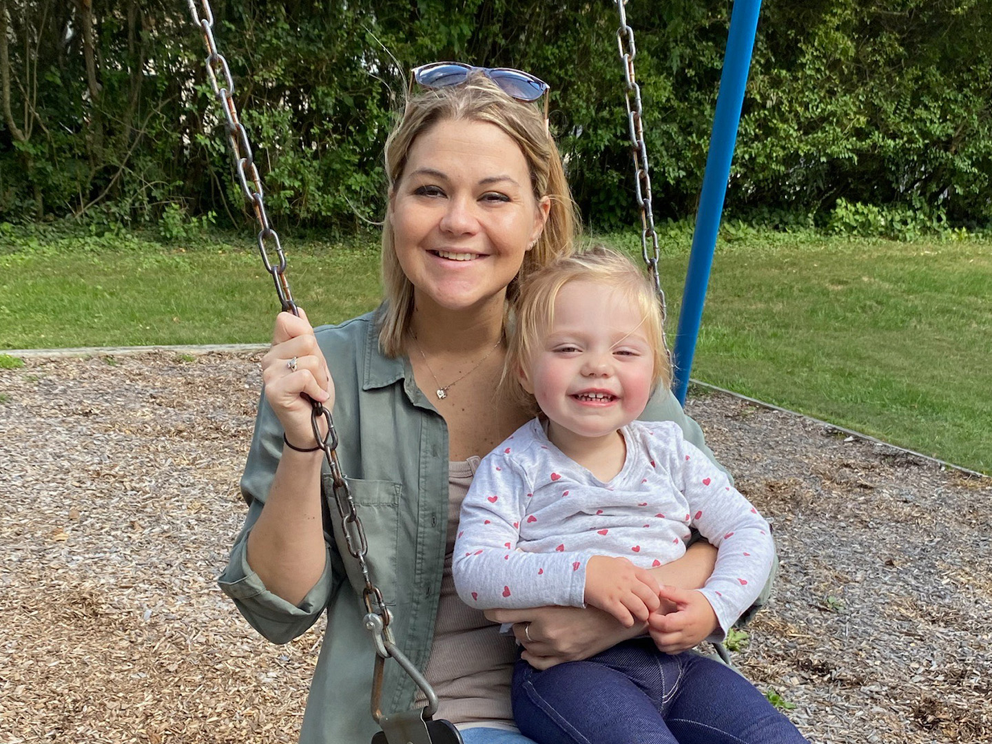 Double organ recipient of a kidney and pancreas, Jessica Bonkoski, on swing set with her child